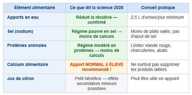 La revue systématique de mars 2026 dans Annals of Internal Medicine a évalué précisément l'impact des régimes alimentaires sur la récidive des calculs d'oxalate de calcium — les plus fréquents. Voici ce qui est démontré :