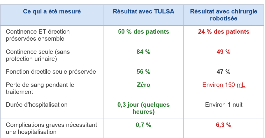 → Résultat principal à 6 mois : 50 % des patients traités par TULSA ont conservé à la fois l'érection suffisante ET la continence sans protection — contre seulement 24 % après chirurgie robotisée. (p < 0,05 — ratio de risque 2,1)